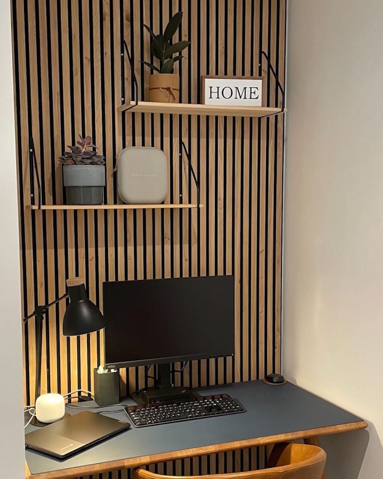 Naast het dempen van geluid kun je ook visuele rust toevoegen. Een houten lattenwand brengt structuur en stijl. De ritmische lijnen zorgen voor een kalmerend effect, wat ideaal is voor ruimtes waar focus belangrijk is.